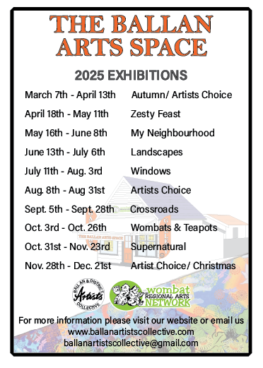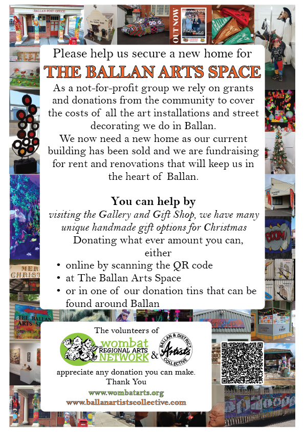 We did it! The new Ballan Arts Space is roaring along, quickly becoming a meeting place for our members and the extended community. We love how the community continues to support us and our sales have been breaking records. You have made a bunch of Artists very happy.