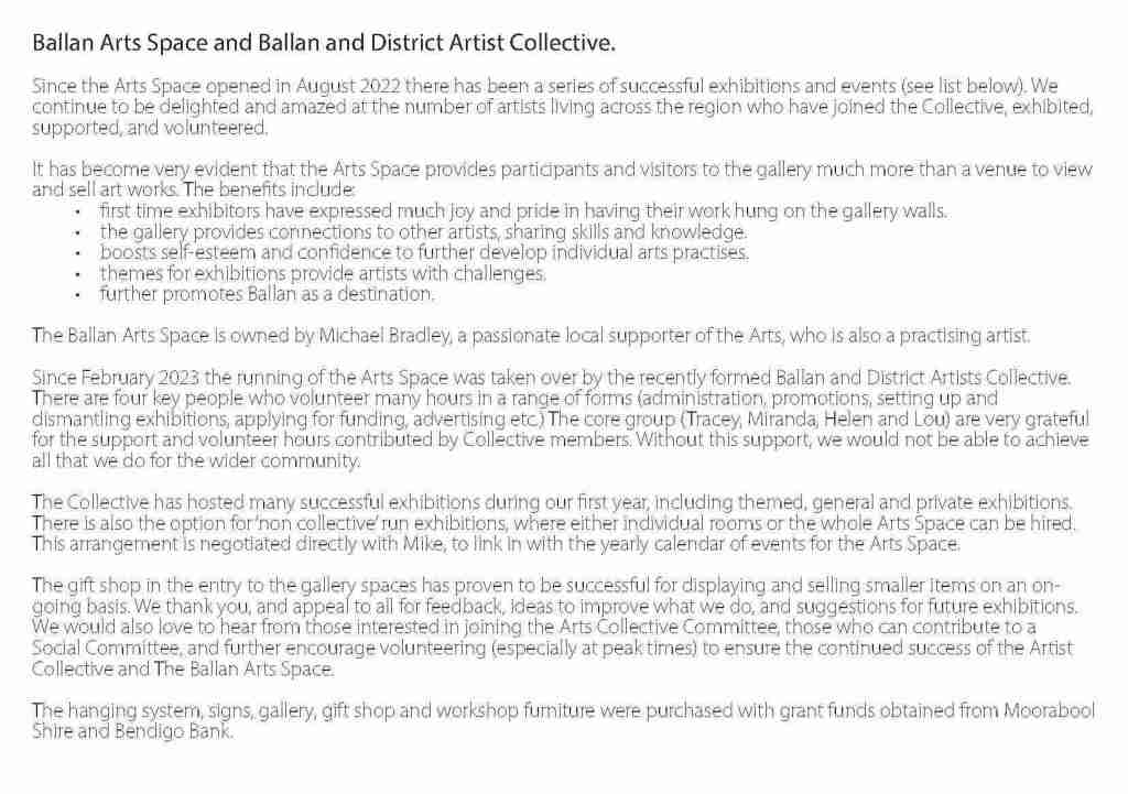 The Ballan & District Artists Collective manage bookings for The Ballan Arts Space.